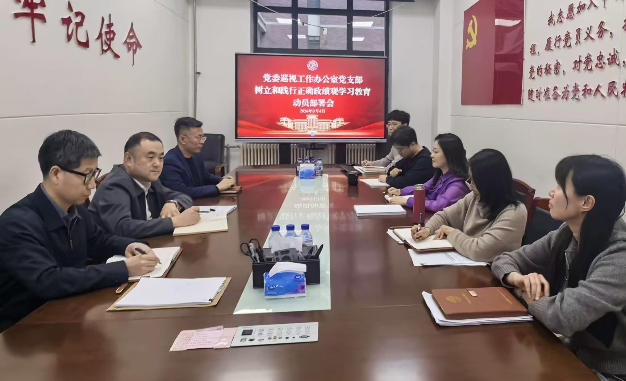 为深入学习领会习近平总书记关于树立和践行正确政绩观的重要论述,认真贯彻落实中央党的建设工作领导小组会议精神,全面落实学校学习教育工作部署要求,3月4日下午,党委巡视工作办公室教工党支部召开树立和践行正确政绩观学习教育启动部署会,全体党员参加会议。